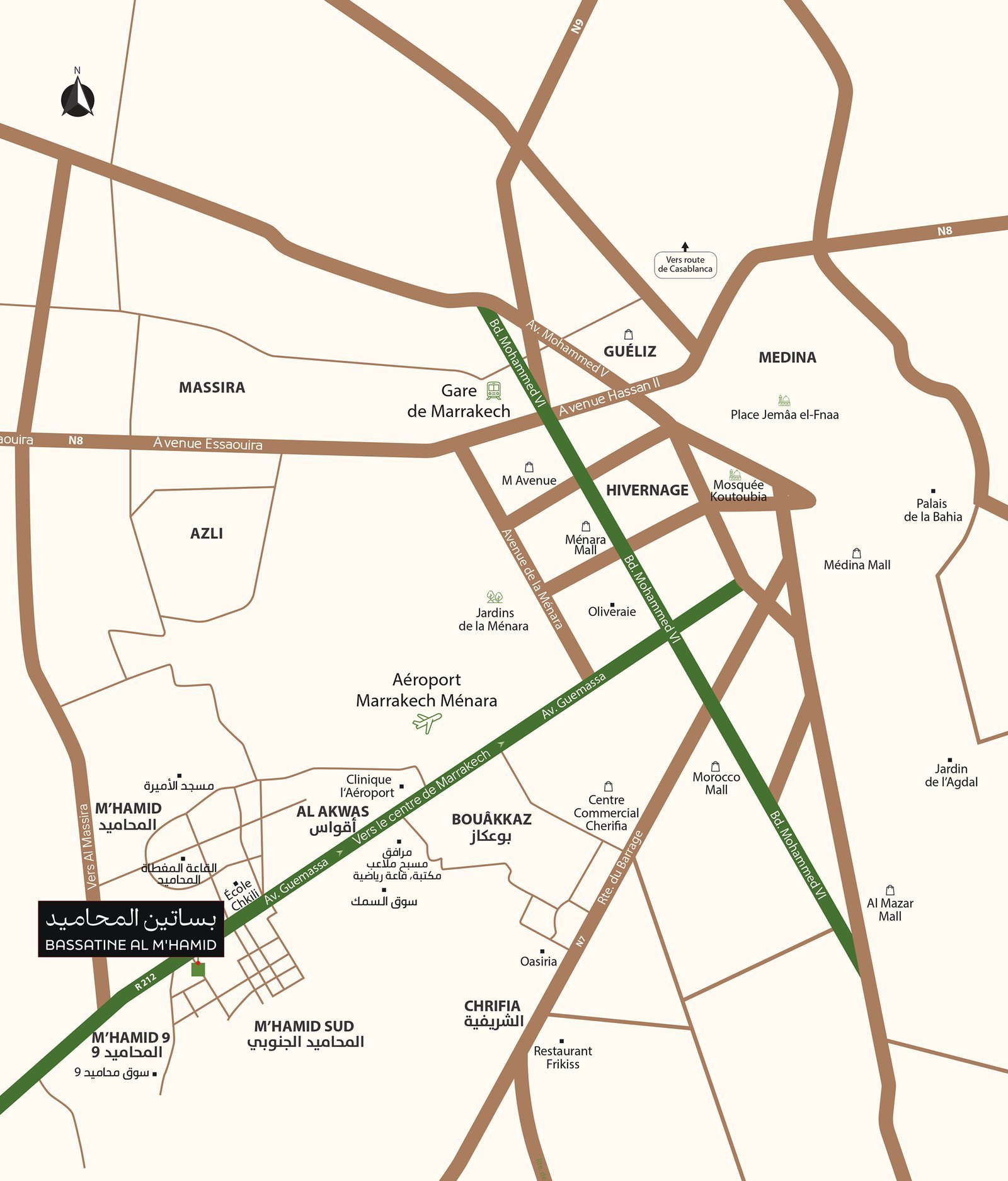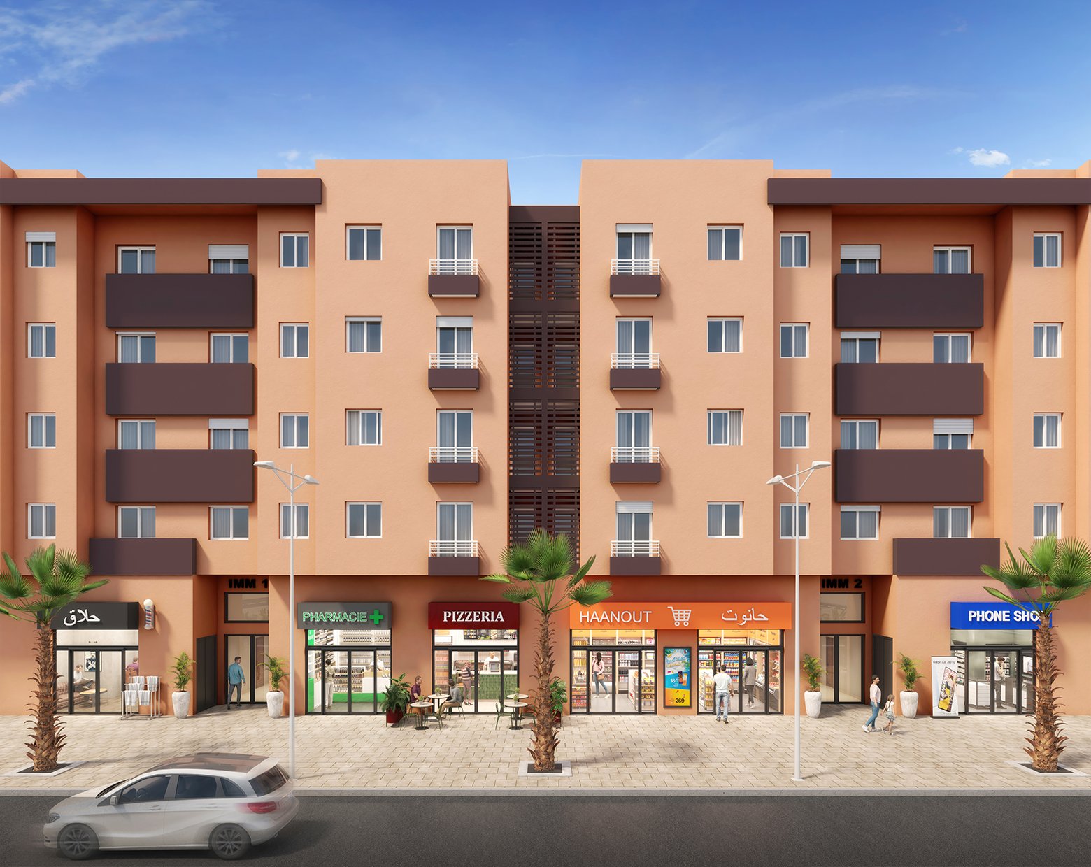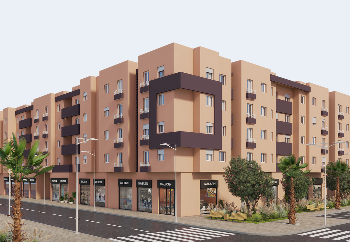 Le projet BASSATINE AL M’HAMID propose des locaux commerciaux situés en rez-de-chaussée des immeubles, avec des façades donnant directement sur les voies du projet, offrant ainsi une excellente visibilité et une accessibilité optimale.